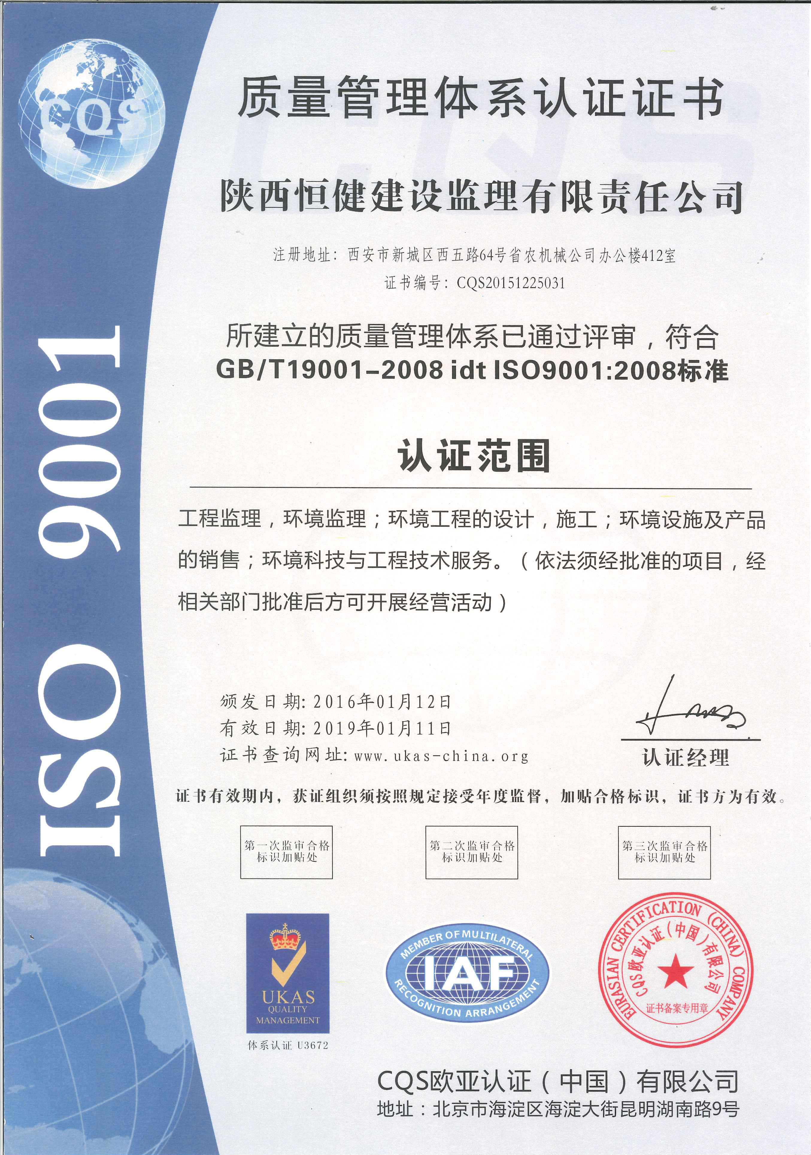 质量管理体系认证证书