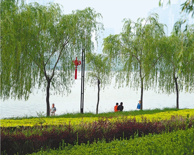 近日,据陕西省环保厅介绍,渭河流域水污染防治三年行动已经圆满收官,渭河干流水质综合评价由重度污染变为轻度污染。据了解,三年行动实施以来,渭河干流主要污染物平均浓度大幅度下降,2014年,干流化学需氧量平均浓度较2011年下降32.9%,氨氮含量下降45.2%。图为5月22日,陕西省咸阳市市民在渭河岸边散步。(新华社记者 丁海涛摄 )
