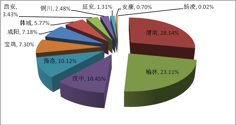 图1-4 2014年陕西省一般工业固体废物的各地产生量所占比例情况