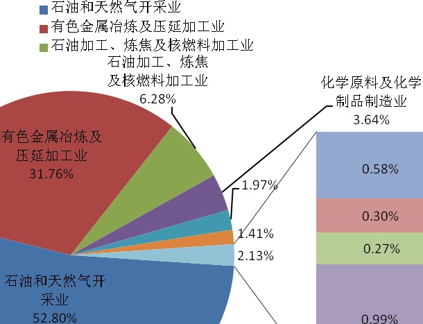 2014年,我省产生的危险废物涉及48个行业,1202家单位。其中石油和天然气开采业、有色金属冶炼及压延加工业、石油加工炼焦及核燃料加工业、化学原料及化学制品制造业四大行业的危险废物产生量占到全省危险废物产生总量的94.49%,如图2-4所示。
