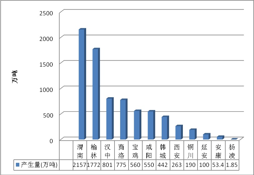 一般工业固体废物产生量较大的城市在我省的关中、陕北、陕南三大地域各有分布,渭南、榆林、汉中、商洛、宝鸡和咸阳分列前6位。渭南钼矿资源丰富,且伴生矿多,其工业固体废物产生量最大,为2157万t;榆林市以煤矿采选业产生的煤矸石为主,汉中、商洛也由于采选过程中产生尾矿,其工业固体废物产生量也较大,分别为1772万t和801万t、775万吨;宝鸡有色金属采选业产生尾矿及废石、咸阳、韩城煤矿采选业产生煤矸石及废石,工业固体废物产生量分别为560万t、550万t、442万t;西安市能源使用率较高,工业固体废物产生量为 263万t;其他几个地市产生量相对较小。如图1-3所示。