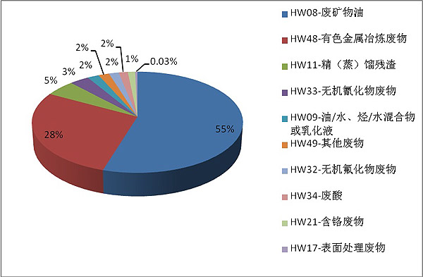 2014年全省执行电子联单转移危险废物涉及34大类,140子类。其中转移HW08-废矿物油77774.4吨,占转移总量的62.5%,比2013年增加0.4个百分点。