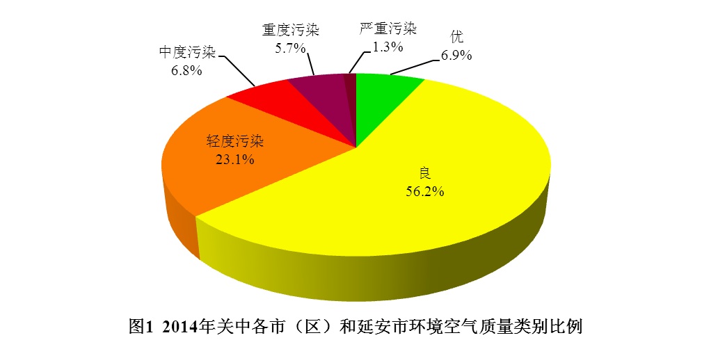 2014年,西安市、宝鸡市、咸阳市、铜川市、渭南市、杨凌示范区和延安市按照《环境空气质量标准》(GB3095-2012)(以下简称“新标准”)监测与评价城市环境空气质量,监测结果显示:关中各市(区)和延安市环境空气质量优良天数比例为57.8%~69.3%,平均为63.1%;省会西安市优良天数比例为57.8%,比2013年提高20个百分点,空气质量明显好转。