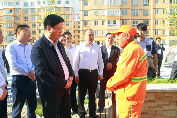 张道宏副省长在宝塔区青化砭镇生态移民小区与卫生保洁员交谈