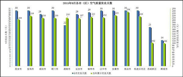 2015年1~9月,全省11市2区空气质量优良天数在100~236天之间。与2014年同期比较,关中各市(区)1~9月优良天数均有较大幅度增加。