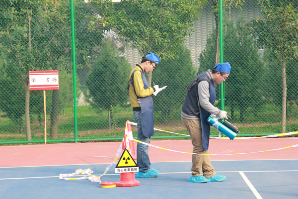 本次演练采用真实放射源作演练对象。各市参演人员集中一处,没有接到考核指令者不得进入演练现场,按照抽签顺序,一组结束后另一组接通知依次入场。应急演习现场由专家将一枚Ⅳ或Ⅴ类放射源随机置于演练现场,以市为单位组成2-3人的搜源小组进行现场搜寻。各市参演人员均携带便携式χ-γ剂量率仪、表面污染仪和防护服、个人剂量报警仪等,按要求步骤进行紧张、有序的搜寻操作。考核组对参演人员搜源操作的规范性及监测报告编写情况进行了现场考核打分,并对各市搜源情况进行现场综合总评。