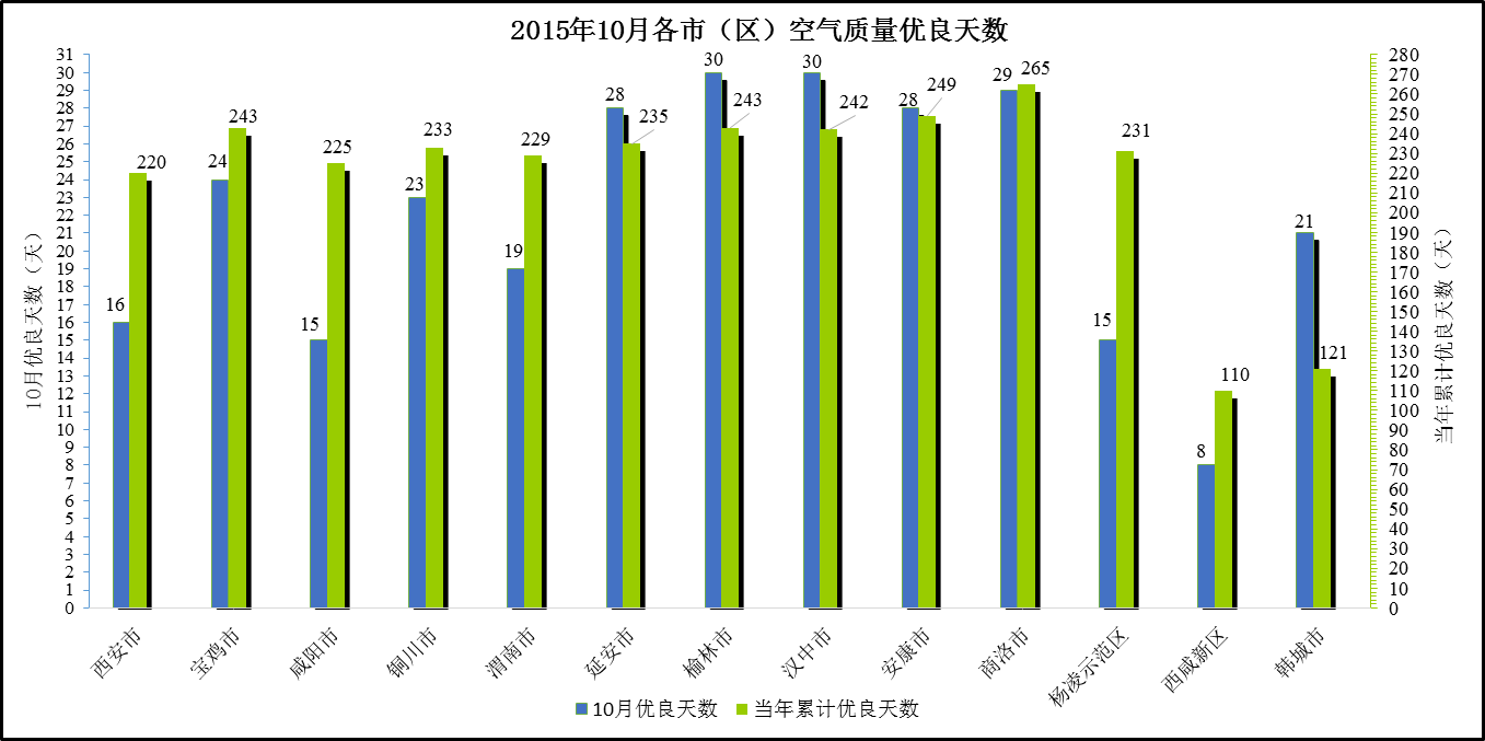 2015年1~10月,全省11市2区空气质量优良天数在110~265天之间。与2014年同期比较,关中各市(区)1~10月优良天数均有较大幅度增加。